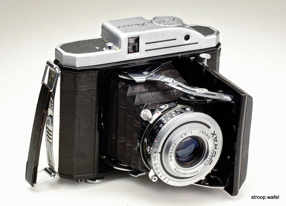Konishiroku Pearl with Hexar 75mm f/4.5 lens in Durax shutter. Note the lack of any wind knobs on top of the camera, as it has a wind key at the bottom.