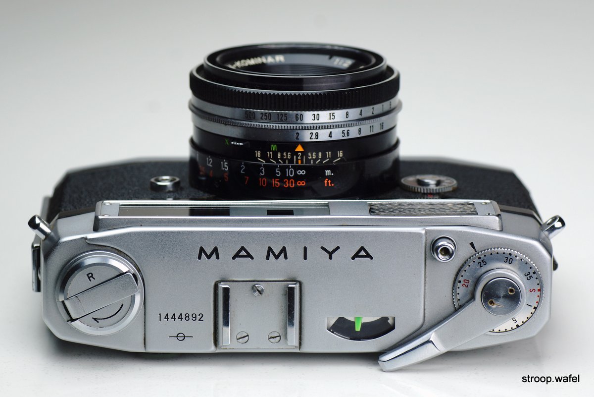 Mamiya 35-II rangefinder camera with Mamiya-Sekor 50mm f/2.8 lens in Seikosha-MX shutter. The camera is well constructed and much heavier than its size suggests, but the chrome plating on the top housing is rather thin and wears easily, as can be seen between the two rangefinder windows.