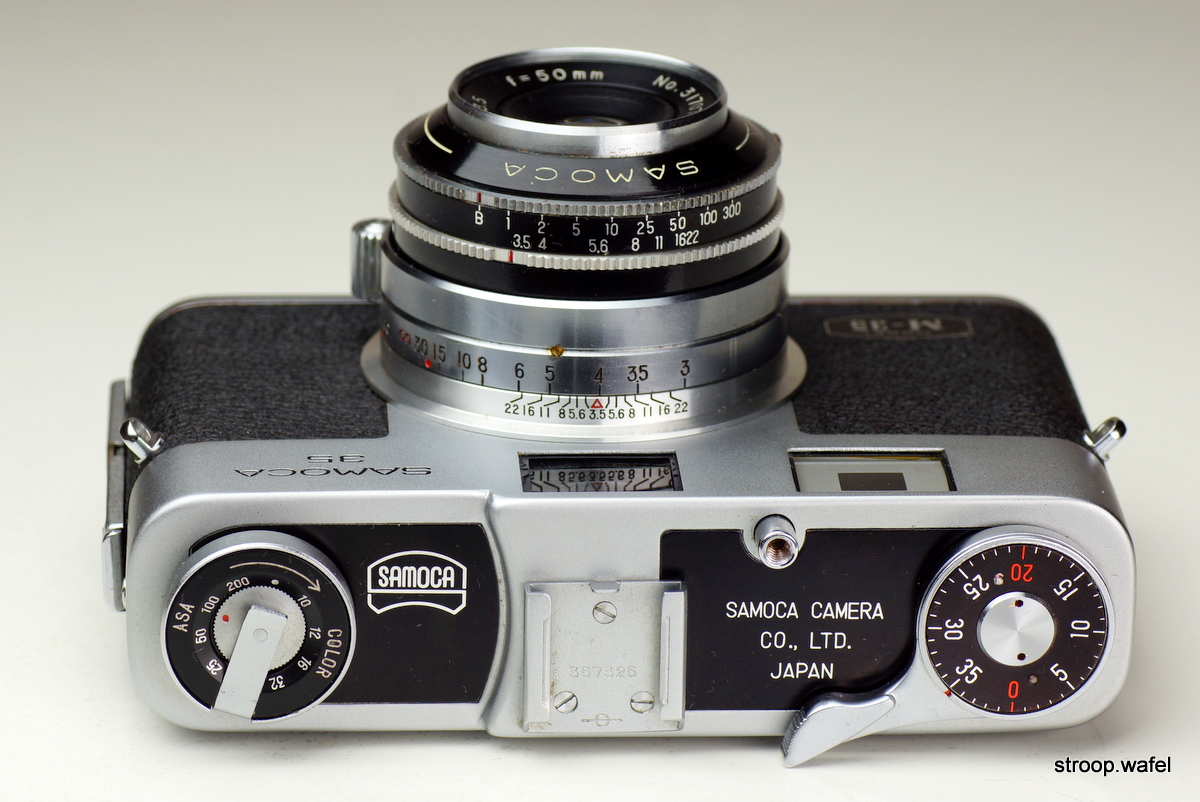 Samoca cameras were made by Sanei Sangyo Co., later renamed to Samoca Camera Co. They started in 1952 with the rather quirky looking Samoca-35 series, the one shown below is the third incarnation. It was a very small camera, similar to the Beirette and Steinette/Hunter35/Primo range to which the camera showed some likeness. It had a rather limited range of shutter speeds but did feature helical focusing. It had a peculiar conical button on the shutter housing which needed to be pushed in to cock the shutter and release the wind lock mechanism. Later versions had a flat top housing with automatic shutter cocking. A version with lightmeter, the E.M., was also made.