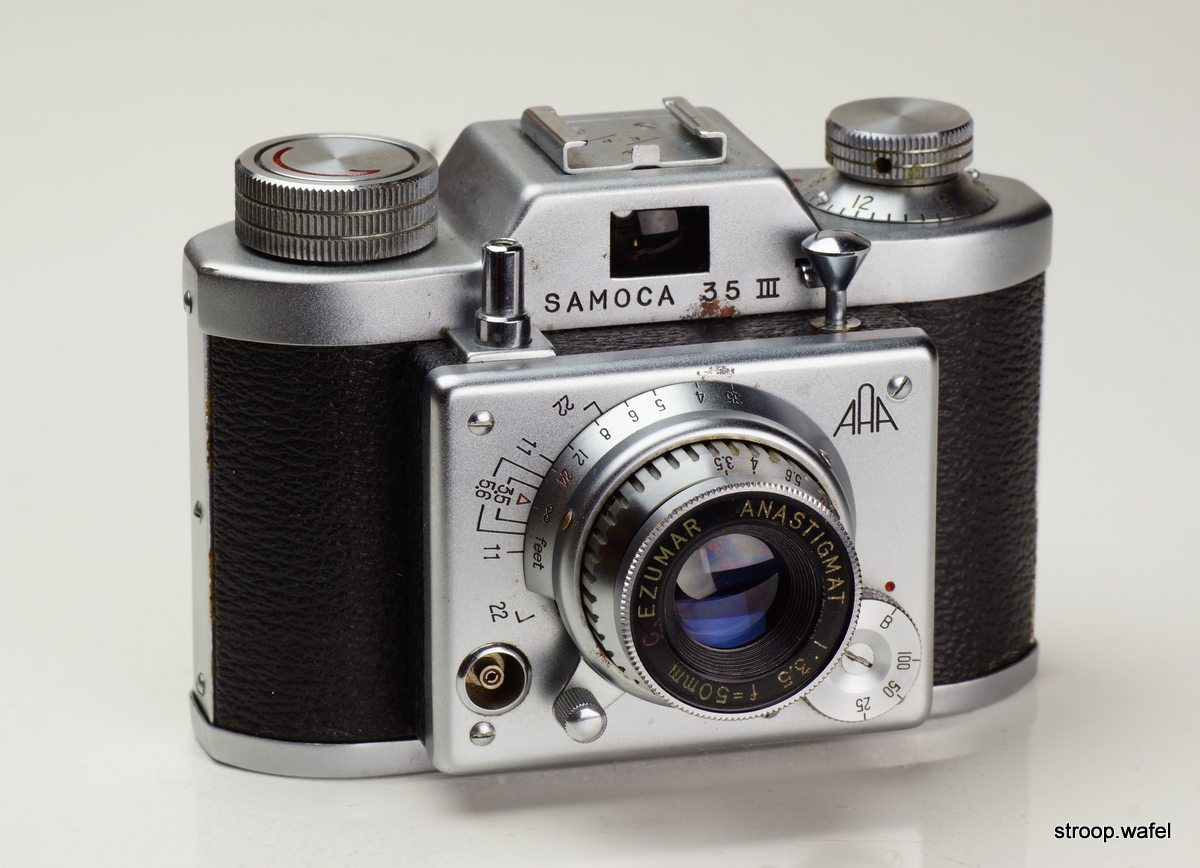 A Samoca-35 III with Ezumar Anastigmat C 50/3.5. The logo of the company, as seen on the shutter, consisted of three As arranged in a triangle; apparently inspired by the company name "Sanei", which can be phonetically understood as "three As" in Japanese.