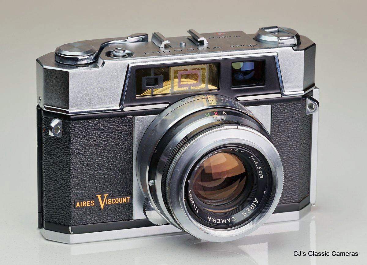 The 1959 Aires Viscount was essentially just a more modern looking upgrade of the Aires 35-IIIL above. It sported the same lens and it functioned very similar. It did have an extra frame in its viewfinder for use with a telelens attachment that could be screwed in front of the main lens. Like its predecessor, it was a heavy and solidly build camera of good quality.