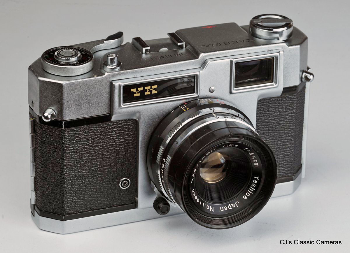 Yashica started making cameras in the mid 1950s. The Yashica YK was the follow up of the Yashica 35, a high-quality rangefinder which was inspired strongly by the design of the Nikon rangefinders, but unlike those, sporting a fixed lens and a leaf shutter. The YK was introduced at the end of the 1950s and was in some ways a downgrade compared to its predecessor, lacking slow shutter speeds and only available with an f/2.8 aperture lens, but not a bad camera in itself. It had a sister camera, the YF, which was more advanced but decidedly less attractive looking. However, the heydays of the brand were still to come, see in particular their TLR cameras elsewhere on this site.