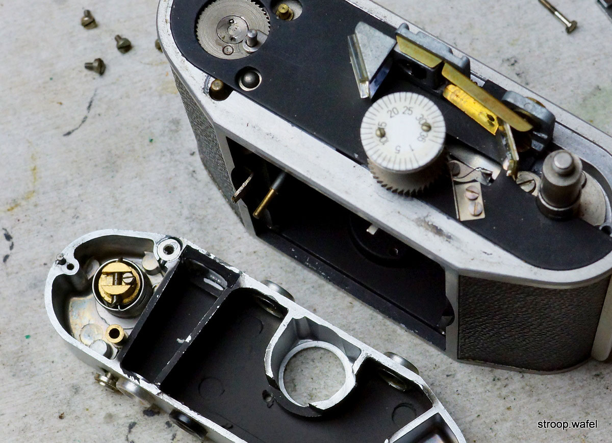 DeJUR D-3 with top housing and lens mount removed. The brass pin sticking out the lens mount opening is the rangefinder link. The top housing has separate compartments for viewfinder and rangefinder.