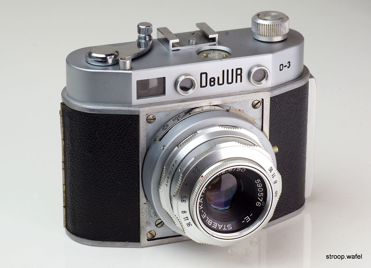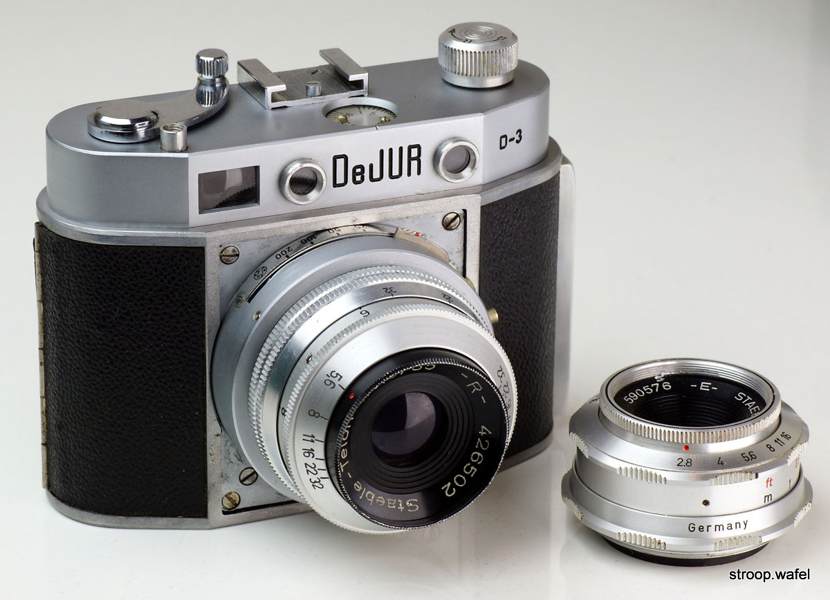 The 1953 DeJUR D-3 was similar to the DeJUR D-1 but was equipped with a coupled rangefinder. The rangefinder and viewfinder were separate, the rangefinder provides an enlarged image for accurate focussing, the viewfinder was used for framing. The camera had therefore two eye pieces at the back. Like on the D-1, the shutter was a Pronto. It was a rebranded Perlux IIa.