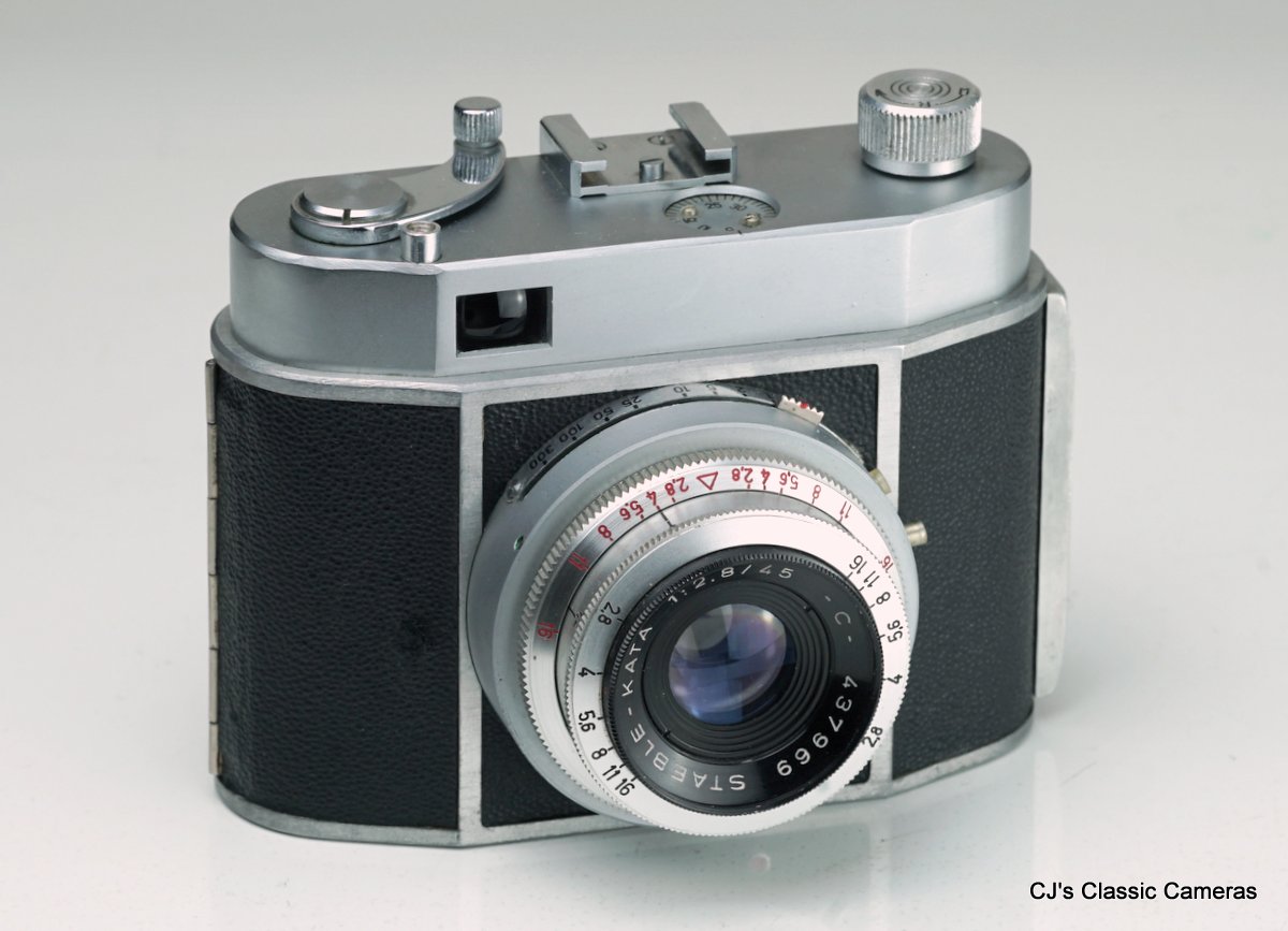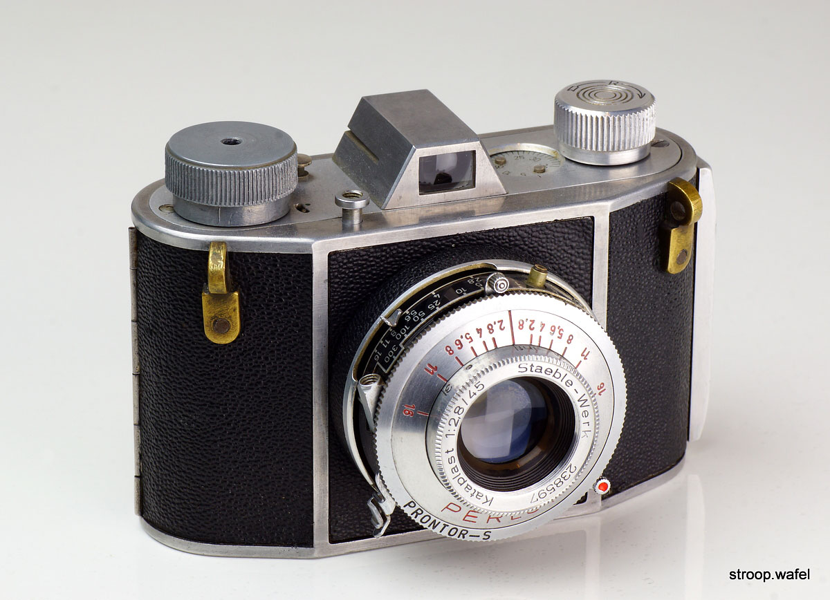 Perlux Ia with Staeble-Kata 45mm f/2.8 lens, which appears to be the standard lens this camera was sold with. Note the peculiar wind lever.