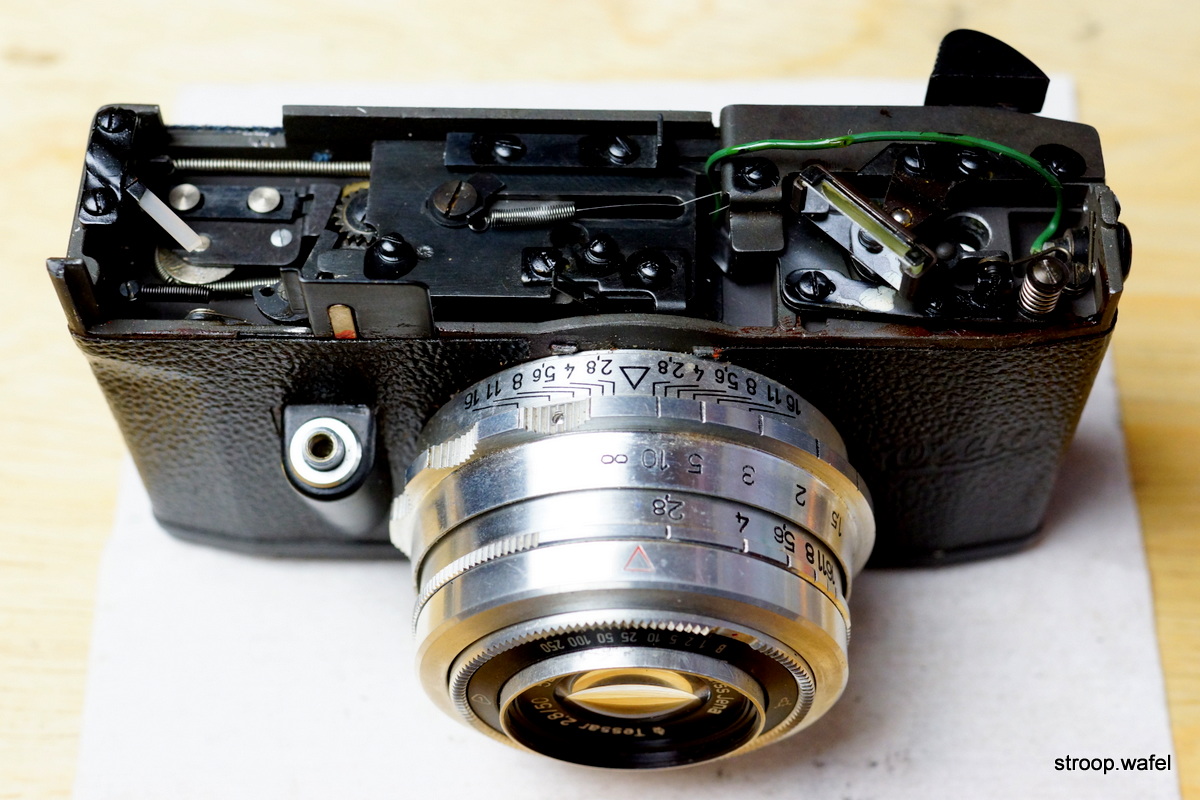 That does not mean it was a bad camera, in fact I think it was a marvel full of clever engineering. The folding strut mechanism was sturdy and secure, and the viewfinder hood moved forward when the camera was folded to make it as compact as possible. The mirror would swing into place when the camera was opened. The taking lens sat on a helical focus mechanism operated by a lever on the left-hand side (from the user's perspective) and the viewing lens focus was coupled to the taking lens by a shaft. The camera was also equipped by an automatic frame counter.