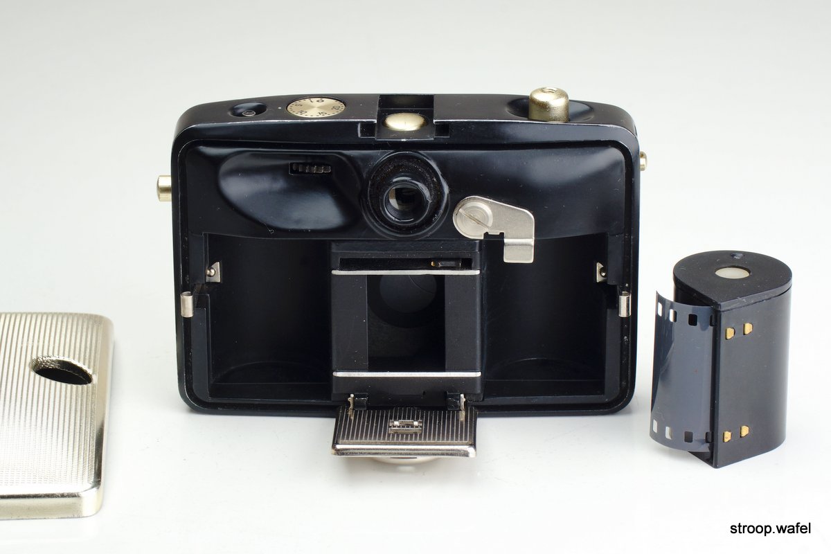 Rear view of the Penti with back removed and film pressure plate down. Also shown is an SL cassette, similar to the Rapid cassette but made from plastic instead of metal and lacking an ISO adjustment. Therefore the Penti had an ISO adjustment setting (lever just about visible on the front view photo above), unlike most other 'Rapid' style cameras.