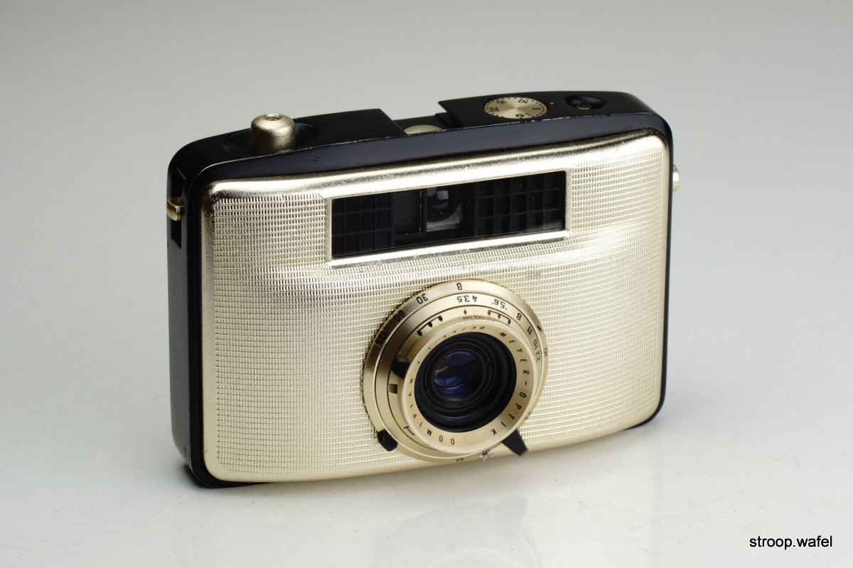 The Welta Penti was a range of small gold-coloured half-frame cameras which I can only assume was aimed at the female market segment. Several different coloured trims were available, such as red, blue and green in addition to black and white. The camera used a Rapid cassette cartridge system, or rather the East-German SL cartridge equivalent, which was very similar but missed the automatic ISO setting of the Rapid cassette. It was a half frame camera with a negative size of 16x24mm. The early Penti was a simple viewfinder camera without lightmeter and almost looked more like a clip open purse than a camera. It had a fixed focus lens and manual aperture and shutter speed. The Penti II added a coupled lightmeter, projected in the viewfinder, as well as focussing ability.