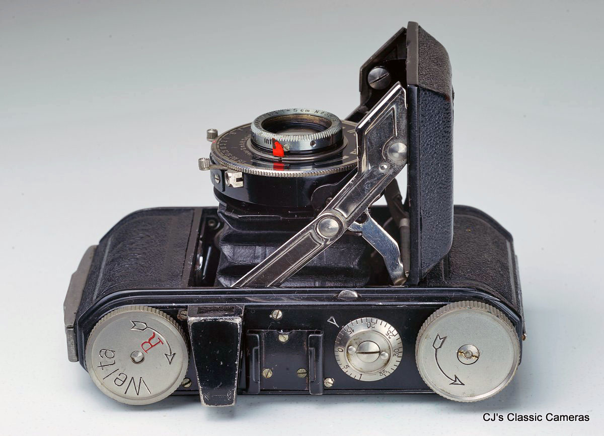 I haven't been able to find any factual information, but I imagine Kodak was not happy with this copy of their own new product line, and the fact is that the early Welti is very rare and was updated around 1937 with a different more rounded body shape and longer but narrower control knobs, and off-centre position of the viewfinder. It still had helical focussing and high-grade optics and shutters; a cheaper variant with front-cell focussing and less well-specified lens and shutter combinations was the Weltix. There is also a variant with black enamel instead of chrome top plate (again, like the Kodak Retina...). As Welta was based in East-Germany after WWII, post-war models had CZJ Tessar or Meyer Trioplan lenses and Vebur or Cludor shutters, but the camera was otherwise largely unchanged until introduction in 1950 of the Welti Ic, which had a larger tophousing with integrated viewfinder. The name implies the existence of a Welti Ia and Ib, but these don't appear to have been used in marketing the cameras.
