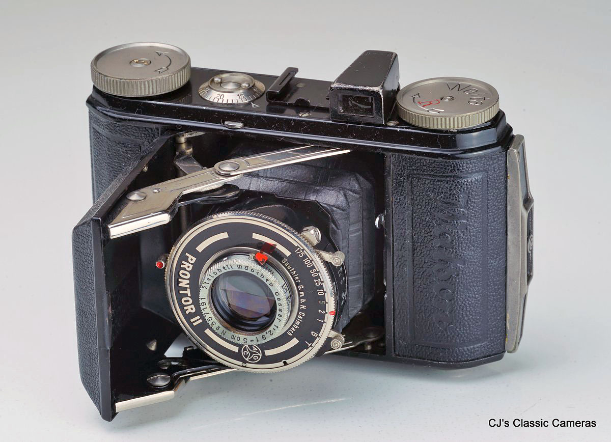 Like the Welti above, the Welta Weltini was clearly inspired by the Kodak Retinas, in this case the rangefinder models, with features such as high-quality lenses and shutters, helical focussing and body-mounted shutter release. It was solidly made and very heavy. However, the Weltini had a few tricks on its sleeve that even the Retinas could not match. For instance, when closing the front door the lens focus would automatically reset to infinity (whereas on the Retina one needed to do that manually first to be able to close the door) and the shutter button was retracted. A superb little camera.