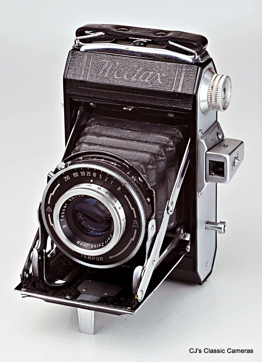 A 1954 Welta Weltax with Carl Zeiss Jena Tessar 75 mm f/3.5 lens in Tempor shutter, typical of post WWII Weltas, as Compur and Prontor shutters were difficult to source in Eastern Germany. This is a Rheinmetall version (engraved at the bottom) as explained above.
