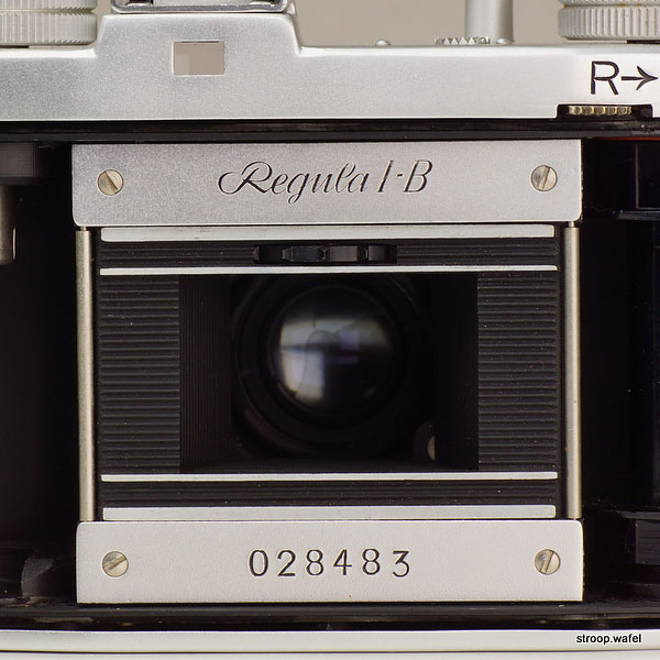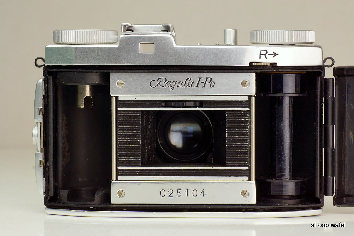 The first version of the King Regula IP with Steinheil Cassar 50mm f/2.8 len in Prontor-S shutter, in some places referred to as the 'Ur Regula'. This was an 'old style' lens with focal length indicated in cm and a small screw as focus stop, later King Regula I had a newer version with internal stop and focal length in mm (see below for examples). This early King Regula version had regular leather covering, instead of the herring bone pattern leatherette typical of all later King Regula I. Body serial# 000865.