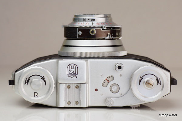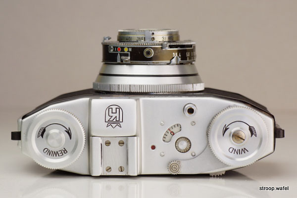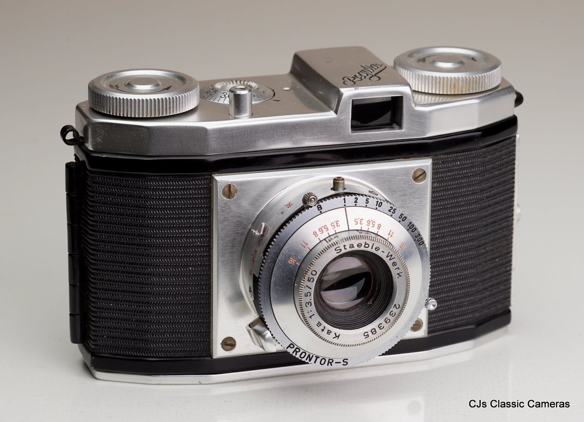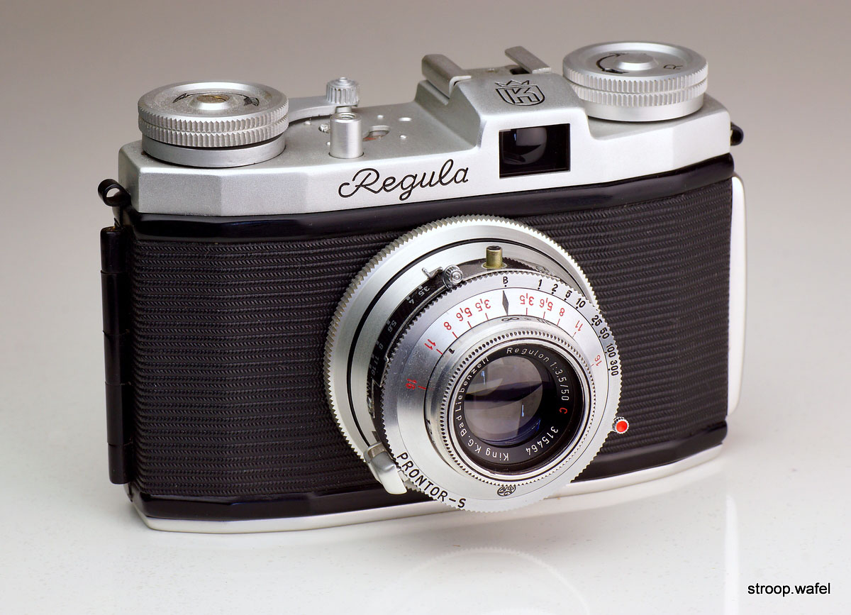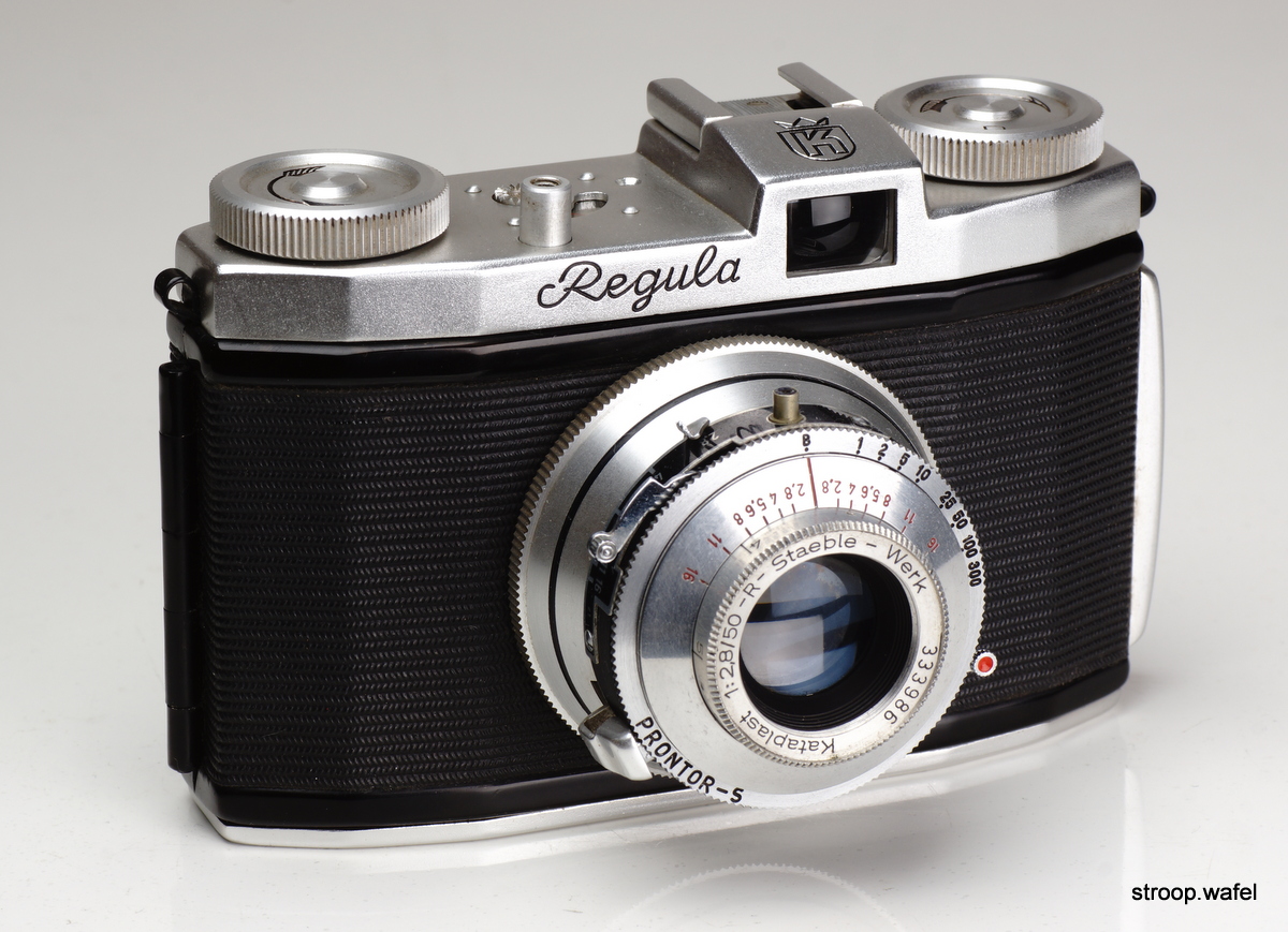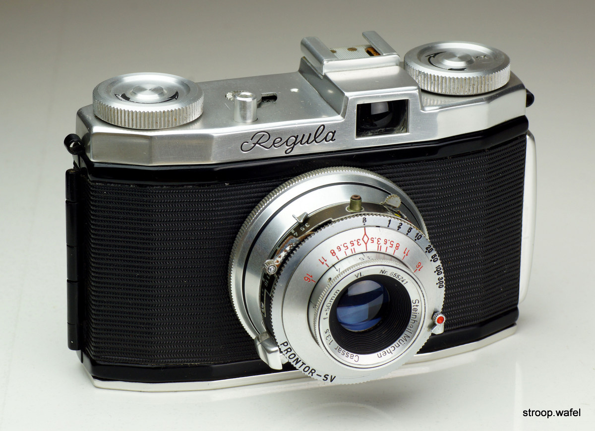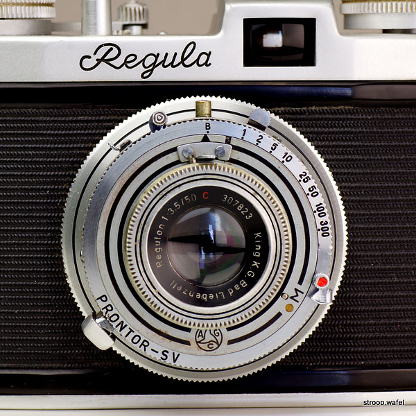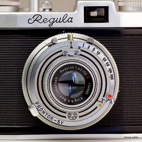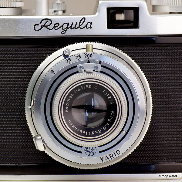 The King Regula I-P was very similar to the late version of the King Regula IP, but the viewfinder housing was different as it had a King emblem engraved on it and it was slightly slanted. It also had a slightly smaller frame counter window. All following King Regula I series models had identical bodies but featured different lens and shutters. The only other variations was the styling of wind and rewind knobs (see below). Furthermore, a wind lever was introduced as an optional feature, indicated in catalogues as 'ST' models (from Schnell-Transport, German for rapid transport), as can be seen in this brochure (in German). King Regula I-Ps had Prontor-S or Prontor-SV shutters and came with various lenses, including Steinheil Cassar, King Regulon and Staeble Kata lenses.