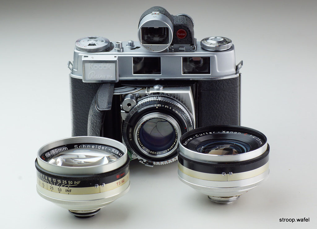 Kodak Retina IIC with interchangeable Kodak Retina-Heligon A 80mm f/4 (left) and Kodak Retina-Heligon C 35mm f/5.6 (right).