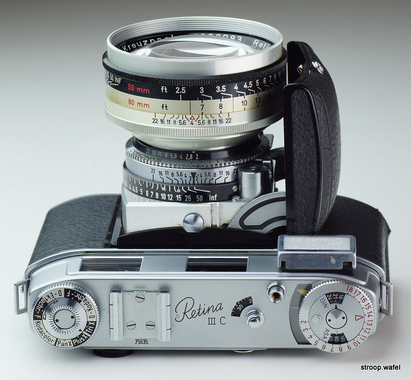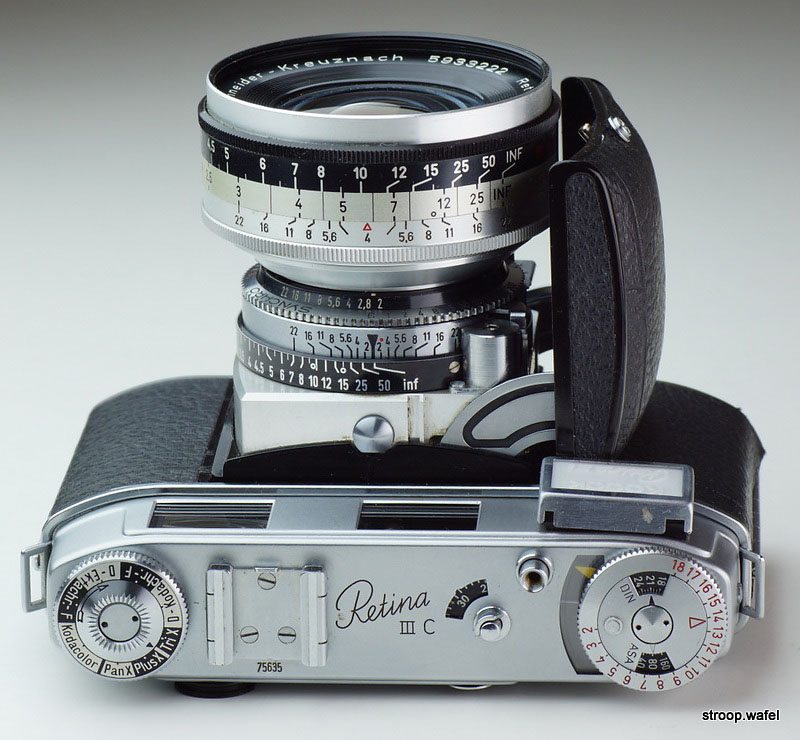 Top view of Kodak Retina IIIC with 35mm (left) and 80mm (right) lenses mounted. Note the focus conversion scales to use the 50mm distance from the rangefinder with the 35 or 80mm lens.