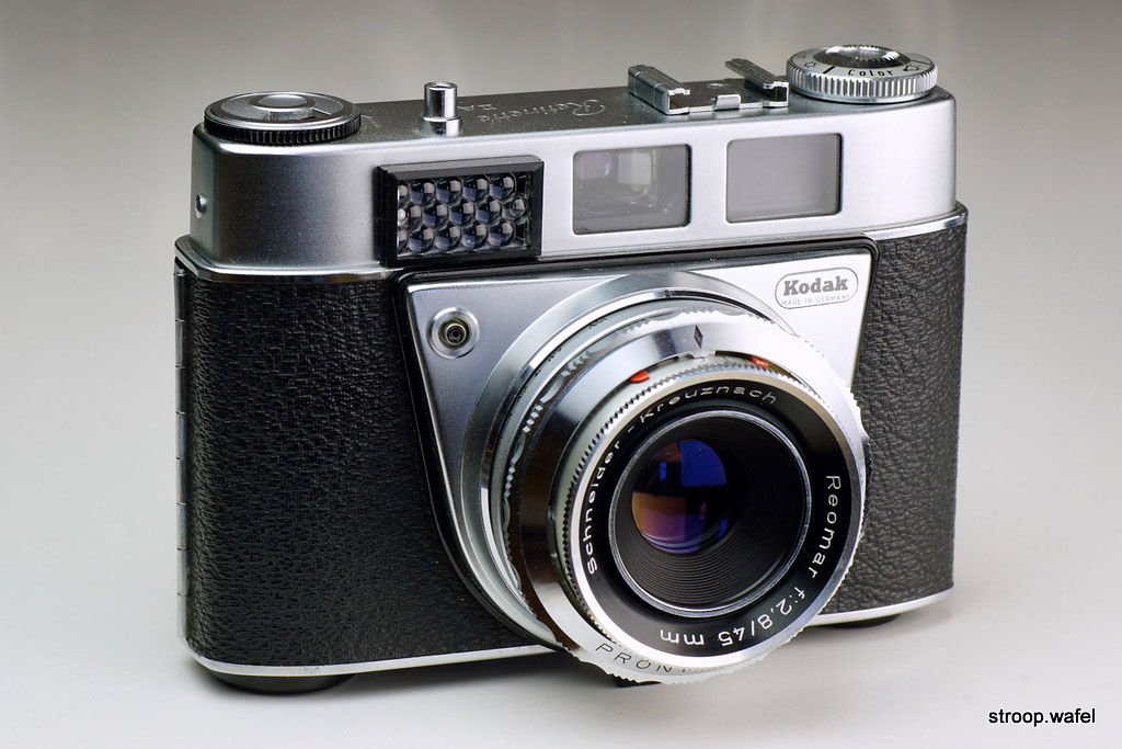 The non-folding Retinette II, with fast Reomar 45mm f/2.8 lens and Compur Rapid shutter. Note the little red tabs, which are sliding depth of field indicators. It had no aperture scale but an LV (light value) scale instead. It is one of my favourite Retinettes.